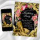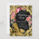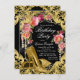 Convites de festas de aniversários de alto salto, brilhando em preto e ouro, com elegante brilho dourado, saltos altos, em uma bela rosa rosa e um fundo brilhante de espiral de ouro pérola. Esses convites de festas de aniversários pretos, dourados e cor-de-rosa são facilmente personalizados para seu evento simplesmente adicionando seus detalhes no estilo de fonte de sua escolha. Este é um design impresso sem pérolas reais, brilho, etc.