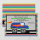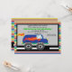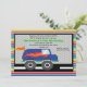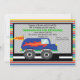 Comece sua celebração com este convite perfeito de caminhão monstro. Faça que o aniversário daquele menino especial seja inesquecível! Este é um caminhão azul brilhante com chamas laranjas ao lado. Ele tem pneus grandes e pretos. Está em uma rua. Tem um fundo xadrez prateado com uma borda preta. O exterior deste convite tem listras finas multicoloridas. Personalize com as informações da sua festa. Confira os muitos outros produtos e cores desta linha. © JW Illustrations