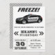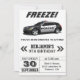 Convide seus convidados com este convite de aniversário policial moderno, com um carro de polícia legal com tipografia ocular contra fundo branco. Basta adicionar os detalhes do seu evento neste modelo fácil de usar para torná-lo um convite de tipo único. Sacudir a placa para revelar um padrão de listras preto e branco elegante na parte traseira da placa.