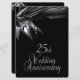 Convites de aniversário de casamento pretos únicos para uma recepção / festa de aniversário de casamento de 25 anos. Parte frontal e traseira preta com texto prateado no verso, dando um visual sofisticado a este convite de aniversário de casamento gratuito.