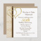 Convite de festa de aniversário de casamento de cinquenta anos elegante feito em forma quadrada, com um padrão de damasco bege e branco, à esquerda e dois acentos de coração dourado. Personalize o texto marrom para o seu evento especial de aniversário de casamento de 50 anos.