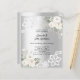 Para um elegante e romântico aniversário de 25. Um fundo com aspecto fino prateado decorado com flores, rosas e rendas brancas. Personalize e adicione seus nomes e detalhes. 1 folha = 1 convite impresso de borda a borda.
