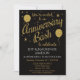 Este divertido convite de festa de aniversário de casamento apresenta fundo preto com balões e estrelas brilhantes em dourado falso. Tem um charme elegante e caprichoso com uma borda estilosa. O casal de aniversariantes vai adorar este convite estiloso, assim como seus convidados. Para 5º, 10º, 15º, 20º, 25º, 30º, 35º, 40º, 45º, 50º ou qualquer outro entre eles!