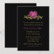Convite de festa de aniversário de casamento de cinquenta anos moderno e elegante feito em preto. Gráficos de um coração rosa emoldurado em dourado metálico, no topo do convite, tem um número gráfico 50 em tom dourado dentro e floreios dourados em ambos os lados. Personalize todo o texto para o seu próximo evento de aniversário.