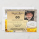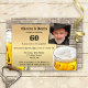 Festa de aniversário com sua foto personalizada em um fundo de tijolos com área de ouro estilizada e imagens de cerveja.