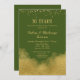 Um convite de aniversário de casamento elegante em verde oliva e dourado, com poeira de confete dourado no topo e brilho dourado no fundo.