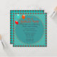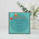 Balões vermelhos, laranja e turquesa brilhantes flutuam sobre o anúncio "É uma festa de aniversário". Círculos turquesa e quadrados vermelhos bordam o convite junto com a área de texto do círculo interno. Personalize com suas próprias informações, estilo de fonte, cor e tamanho. O verso tem uma área de texto para informações adicionais da festa. Exclua se não for necessário.