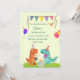 Faça o aniversário do seu pequeno rugir de alegria com este adorável convite de aniversário temático de dinossauros! Com dois dinossauros fofos de chapéus de festa, balões coloridos e detalhes divertidos, este convite é perfeito para meninos e meninas. Fácil de personalizar com o nome da criança, data e detalhes da festa. Um design divertido e alegre que define o tom para uma celebração de aniversário de dinossauro inesquecível.