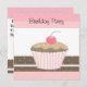 Um bonito convite de aniversário com um cupcake de chocolate em um pelotão cor-de-rosa tocado com uma cereja. Bordas de rosa e chocolate soam no topo e no fundo do convite. Personalize com todas as informações de aniversário conforme desejado.