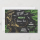 Convite à apresentação de pranchas para o dia de aniversário de três rex do Dinossauro com folhas tropicais e dinossauro dourado.