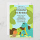 Comece a festa de aniversário do seu filho com nossos adoráveis convites de aniversário de dinossauro! Nosso convite para aniversários de criança dino apresenta dinossauros bonitos em um fundo de folhas da selva. A parte de trás do convite para aniversários de criança apresenta palmeiras e folhas com um dinossauro azul giro. Perfeito para um primeiro aniversario de rapazes ou qualquer idade de aniversário. Fácil de personalizar com as informações de festa de aniversário. Visite nosso compro para ver as notas de agradecimento, autocolantes e selos de correio. ©Babystar Designs
