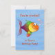 Um convite de aniversário de criança alegre e divertido com um peixe de desenho colorido num mar de azul. Todo o texto é facilmente personalizado por você. Corresponde ao cartão de aniversário personalizado do Fishy Fun. Se precisar mover o texto, escolha "Personalizar".