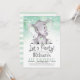 Convite de festas de elefante verde de horta bonito para garotos ou meninas. Fundo de aquarela e striped para trás.