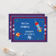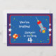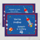 Um lindo Convite de festas de aniversário com uma nave espacial voando pelo céu com um planeta e estrelas. A imagem está rodeada de uma borda vermelha com três estrelas amarelas em cada lado sobre um fundo azul. O texto pode ser personalizado para sua ocasião especial.