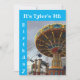 Imagem de um brinquedo de balanço em um parque de diversões na frente. Detalhes da festa no verso.