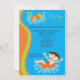 Splish Splash estamos tendo um baixo!Comece a comemorar com este convite adorável. Perfeito para a festa de piscina daquela aniversariante. Tem um fundo azul brilhante. À esquerda do convite está uma borda ondulada laranja com uma faixa verde abaixo. Ao lado disso está um garoto adorável em um tubo laranja flutuando na água. No topo do convite diz "festa de piscina" e os O's são bolas de praia. Veja os muitos outros produtos e designs nesta linha de piscina.