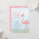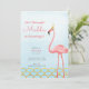 Uma aquarela desenhada à mão convida com um flamingo cor-de-rosa e ondas escamoteadas douradas contra um fundo azul-céus