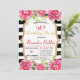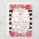 O Convite de aniversário com fundo listrado preto-e-branco, rodeado por flores e quadros de ouro no centro, faz dele um convite perfeito elogiando uma noite inesquecível, passada com mais proximidade.