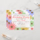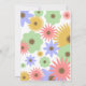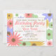 Um convite de aniversário com um fundo de flores retrorinspiradas em vários tons pastel de rosa, roxo, laranja e verde. Personalize o texto sobre a seção central na frente com detalhes da sua ocasião.