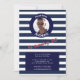 Faça um salto com este convite de aniversário personalizado! Ele apresenta um sofisticado padrão riscado horizontal, azul e branco, em marinho, fornecendo um pano de fundo limpo e elegante para seu evento especial. A design inclui um espaço circular para uma foto apreciada, fazer-a como uma marca de seleção verdadeiramente única e pessoal. O esquema de cores é clássico e eterno, perfeitamente adequado para uma celebração de aniversário de qualquer idade. Inclua todos os detalhes da sua parte, garantindo que todos os seus convidados tenham todas as informações necessárias. Peça hoje e torne seu partido inesquecível! Esta design é perfeita para uma festa temática náutica ou qualquer reunião de aniversário sofisticada.
