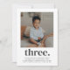 Um aniversário de 3 anos moderno convite com sua própria foto e a palavra 'três' embaixo.