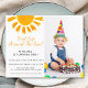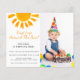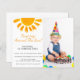 Você está planejando a primeira festa de aniversário de um garoto com temática solar? Este belo convite orçamentário é decorado com uma aquarela amarela, sol e tipografia de na moda. Facilmente personalizável com sua foto e detalhes. Original Watercolor © Michele Davies.