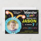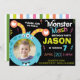 Divertido, ousado e brilhante monstro mash design de convite de aniversário temático. O design apresenta um personagem monstro fofo e divertido, que você pode colocar na sua própria foto atrás para uma aparência única personalizada. Um fundo preto escuro desfaz o personagem monstro colorido e o pop de elementos design. A design de estilo do personagem foi aplicada ao layout do design de convite e fontes para criar um convite de aniversário ousado e divertido com personalidade e estilo. O verso do convite apresenta um fundo colorido, cor-de-rosa, azul, laranja, limão e verde listrado para retirar as cores do monstro na frente. Todas as ilustrações contidas neste divertido e colorido convite para comemoração da festa de aniversário de fotos mash do monstro são obras de arte originais feitas à mão pela Moodthology. Você pode personalizar o tamanho do texto, a cor do texto, a fonte e o layout para sua preferência de design pessoal.