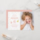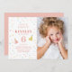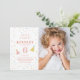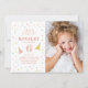 Um convite de aniversário fotográfico de crianças caprichadas com aspersão do arco-íris, nome grande e idade e chapéus de festas.