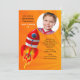Um convite juvenil com um foguete vermelho na decolagem. O fundo tem raios de ouro e uma janela de fotos redondas. Adequado para ambos os sexos.O cartão é fácil de personalizar com seu texto, fonte, cor da fonte e escolha de seis tipos de papel.