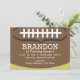 Um convite de aniversário de futebol com tema temático, que apresenta uma ilustração muito grande de um futebol que cobre a maior parte da superfície do convite. O plano de fundo e o inverso são verdes, mas podem ser personalizados. O texto é branco.