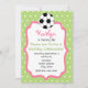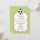 Um convite de aniversário de futebol para uma menina. O plano de fundo de ambos os lados é verde com bolinhas brancas. A frente tem um quadro cor-de-rosa cheio de branco e uma bola de futebol no topo. Personalize o texto rosa, verde e cinza com detalhes da sua ocasião.