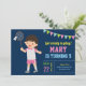 Incêndios para seus convidados com este convite de aniversário colorido com uma garota fofa tocando badminton com uma tipografia vibrante contra um fundo azul. Basta adicionar os detalhes do seu evento neste modelo fácil de usar para torná-lo um convite de tipo único. Sacudir a placa para revelar um padrão colorido de listras na parte traseira da placa.