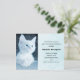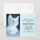 Cartão postal de convite de aniversário com uma fotografia adorável de um gatinho branco de pelo curto com olhos azuis brilhantes. Olhando para longe. Patas cruzadas de forma típica de gato.