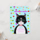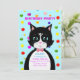 Cartão de convite de aniversário com um lindo gato smoking como mensageiro e bolas multicoloridas em fundo turquesa. Todo o texto pronto para ser personalizado.