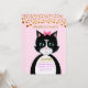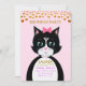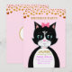 Convite de festa de aniversário com um lindo gato smoking como mensageiro com confetes dourados como cabeçalho em fundo rosa. Todo o texto pronto para ser personalizado.