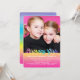 Este convite de aniversário fotográfico brilhante e colorido lê "Meninas de Aniversário" em cores de arco-íris. O verso do cartão apresenta listras de arco-íris em aquarela em rosa, laranja, amarelo, verde, aqua, azul e roxo. A imagem do modelo é propriedade da Orabella Prints e, portanto, protegida por direitos autorais. Copiar ou usar esta foto de qualquer maneira é estritamente proibido.