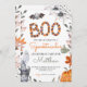 Adorável convite festivo de halloween que inclui fantasmas, abóboras, morcegos, aranhas e folhas de outono.
