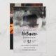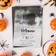 Uma mansão assustadora saindo da névoa, em preto e cinza com sotaques de laranja e roxo. Ilustração original de Becky Nimoy. Personalize o título da festa para qualquer parte como "festa de aniversário", "casa assombrada", "festa de fantasia" etc. O gráfico de Halloween pode ser excluído.