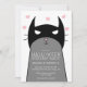 Ótima ilustração de um gato cinza vestindo uma máscara de morcego. O batcat tem corações flutuando ao seu redor. Na barriga dele, há textos editáveis para informações sobre a festa de fantasia de Halloween. Excelente de uma festa do dia das bruxas para festas de crianças e festas de amantes de gatos.