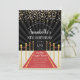 Convites de festas de aniversários de criança bonitos de Hollywood são perfeitos para o momento da estrela de cinema em destaque! Os convites apresentam um tapete vermelho e um design de corda veludo com os detalhes da festa de aniversário em letras brancas, revestidos com uma mancha esbranquiçada e um confete dourado.