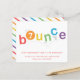 Este convite de aniversário de salto apresenta letras saltitantes em uma paleta arco-íris de cor neutra do gênero, vermelha, laranja, amarela, verde, azul e roxa, com idade editável no O. Uma tomada super divertida e neutra do gênero em um trampolim, ginástica ou festa de salto. Este convite é inspirado por todas as crianças que gostam de saltar, saltar e voar. Clique em editar para personalizar.