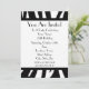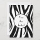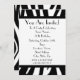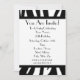 Um convite simples com um design de impressão zebra na parte superior e inferior da frente. Fita preta e fonte preta parisiense. Personalize com detalhes da sua ocasião. O lado oposto apresenta design sólido com uma forma circular no meio, moldando texto.