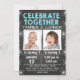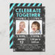 Este convite de aniversário de quadro-negro de inverno para gêmeos meninos ou uma festa de aniversário conjunta de meninos. Este design apresenta alguns flocos de neve prateados falsos em uma imagem de fundo de quadro-negro.
