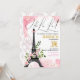 Adorável convite de aniversário com um tema de Paris que inclui um fundo de aquarela cor-de-rosa com uma flur de lis e a Torre Eiffel vestida num arco cor-de-rosa com Cherry Blossoms e um galho de folha verde. O texto do espaço reservado para as fontes pretas, cor-de-rosa e douradas é facilmente atualizado com seus detalhes. "Ooh La!" em texto ousado no topo adiciona ao entusiasmo.
