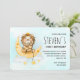 Convite de aniversário com uma ilustração de aquarela fofa. Um leão adorável usando uma coroa pescando estrelas sentado em uma lua crescente apoiada em uma nuvem fofa. Ilustração de fantasia mágica. A parte inferior tem uma borda de estrelas douradas pequenas. Fundo de aquarela azul claro.