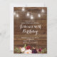 Marsala String convite de aniversário leve apresentando cordas de luzes com fundo de madeira rústica.