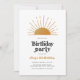 Convite de aniversário com meio sol com raios. Personalize com suas informações. Clique em "clicar para personalizar mais" para alterar o estilo, o tamanho ou a cor da fonte.