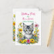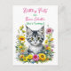 Uma ilustração em aquarela de um gatinho cinza listrado em uma cama de flores amarelas e rosas para convite de aniversário de menina.