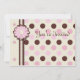 Este convite para festas de aniversario de meninas 5x7 tem bolinhas cor-de-rosa e castanhas com borda de fita marrom e creme. Há uma flor feita de "papel" floral no topo da fita. Na parte de trás, há uma borda de pokadot com um centro de creme com algumas flores. Você pode personalizar facilmente as informações de sua parte.