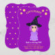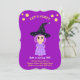 Convite de aniversário de menina fofa com padrão de estrelas em fundo roxo real no verso. Ideal para festas de aniversário e Halloween. Todos os textos e números estão prontos para serem personalizados.